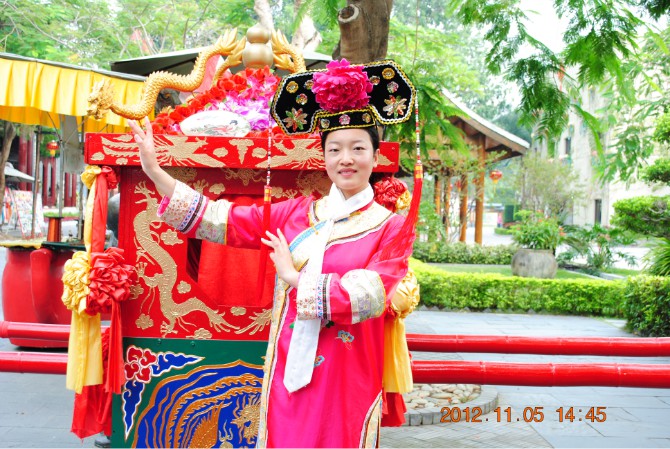 世界之窗通過微縮景觀讓我們大開眼界,不僅有世界各地的標志性建筑而且融合了多姿多彩的西方文化特色和風情。我們在這門口拍了張照,便奔到了錦繡中華。園內(nèi)充分展示了中華五千年的文化,其博大精深讓我們嘆為觀止。大街上有粉墨登場的踩著高蹺高調(diào)游行的小丑,街邊有轉(zhuǎn)動的水車,有擺著冰糖葫蘆,還有各種有意思的面具和頗具時代感的工藝品。出于對藝術(shù)家的尊重,我買了兩個用銅絲線做成的小腳踏車。其中各種各樣的表演,精彩紛呈。最具代表性的有兩個,露天上演的《金戈戰(zhàn)馬》和室內(nèi)演出的《中國印象》。在跑馬場上,以古代城樓為實景,一群英姿颯爽的跑馬溜溜的漢子英勇無敵,策馬奔騰,飛馳原野。除了情景演義還有各種馬上特技表演。如馬上飛馳交鋒,雙人夾擊交戰(zhàn),側(cè)身飛馬撿哈達,飛馬穿越火線,等驚險而刺激。整場氣勢震撼人心,仿佛走到了那戰(zhàn)火紛飛的年月。《中國印象》則以中國服飾文化為主題,是一場唯美的視覺盛宴。舞臺上的美女有著高挑苗條的身段,散發(fā)著東方女性特有的氣質(zhì),他們無不阿羅多姿,風情萬種,將中國古代各段時期不同地域還有頗具韻味的少數(shù)民族服飾詮釋的淋漓盡致;蚩蓯矍纹ぃ騼(yōu)雅高貴,或清新亮麗,或妖冶如火。有著西域的神秘色彩,又有著江南的溫柔小情調(diào),更有著皇宮的雍容華貴。性感有如勾人魂魄,動感則讓人聞歌起舞。每一個造型都刻著豐富的文化內(nèi)涵,它代表的是人們對時代的認同感,對人性的理解,和對審美的更高追求。