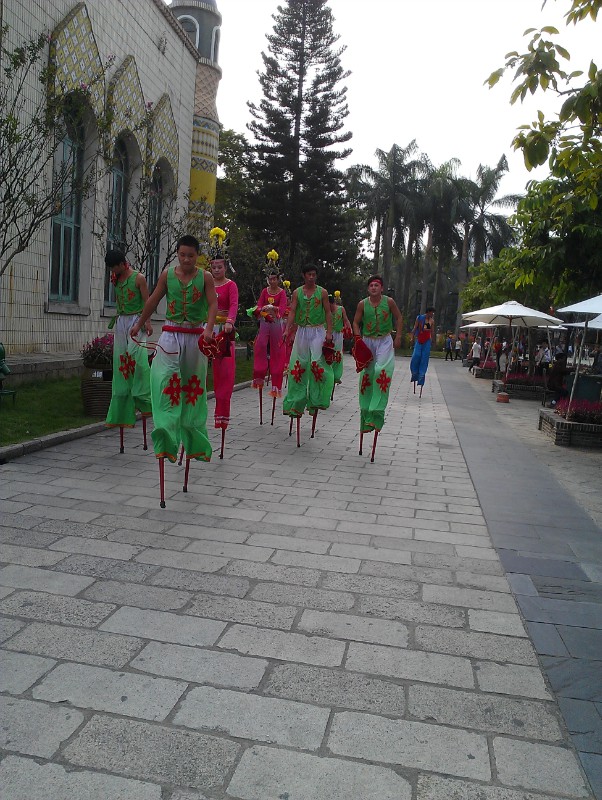 第三天我們留給了具有現(xiàn)代化氣息的東部華僑城(簡稱OCT.east )。 這是一個世界級的度假村,分三大區(qū) ,充分體現(xiàn)了自然與人的和諧共處。高爾夫球場的綠茵萬頃,大華興寺的香火繚繞,竹林深處的曲徑通幽,梯形茶田的清新蕩氣,五色花田的炫彩芬芳,因特拉根蘭花園的奇特浪漫,還有穿插其間各種先進娛樂設(shè)施帶給你無限的激情挑戰(zhàn),無論是釋放壓力,尋找田園的僻靜,還是放慢生活的腳步,這無疑是一片最接近心靈的土壤。它是一個天然大氧吧,你可以盡情暢快的深呼吸,吸收山水的靈氣 。在這有一個特殊的文化氛圍,那便是華僑風情。歌舞表演非常具有歐美范兒,熱辣搞笑。周圍建筑也是一派西式洋房,頗有情調(diào)。一個朋友叫我到塑像前拍照,剛開始我都沒從正面瞧,只知道是個帥哥鍋拿著把吉他,都沒有意識到是活的,擺動作時,我無意碰到他的肩膀便嚇了一個狠的,我以為是瞬間激活呢,弄得那尊“雕像”都移位了,看他快要倒了,還使勁的拉,拉了幾個來回。在場所有人都笑趴了,唯有這位銅人依舊從容淡定。可是當我們走時,他狡黠的來回轉(zhuǎn)動了他那兩只圓滾滾的眼珠。如果在里面走累了,可以租腳踏車,乘游覽車、觀光大巴,還可以坐索道或者體驗深林小火車穿梭蜿蜒其中。
